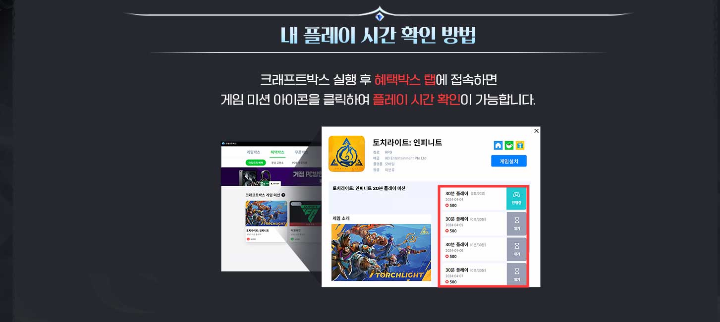 게임플레이 시간은 게임을 종료하거나, 일정 시간(PC방:30분/개인PC:10분)이 경과할 때마다 업데이트됩니다.